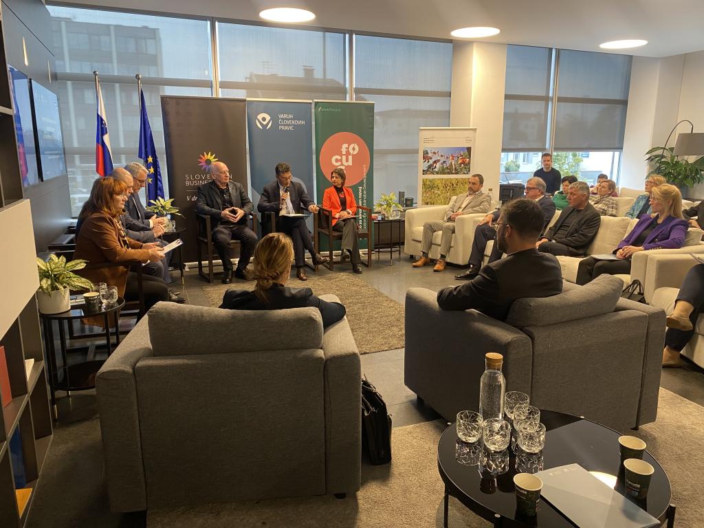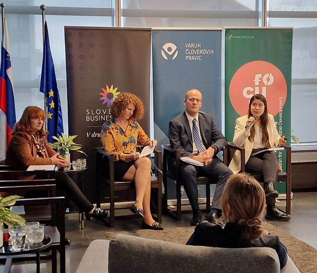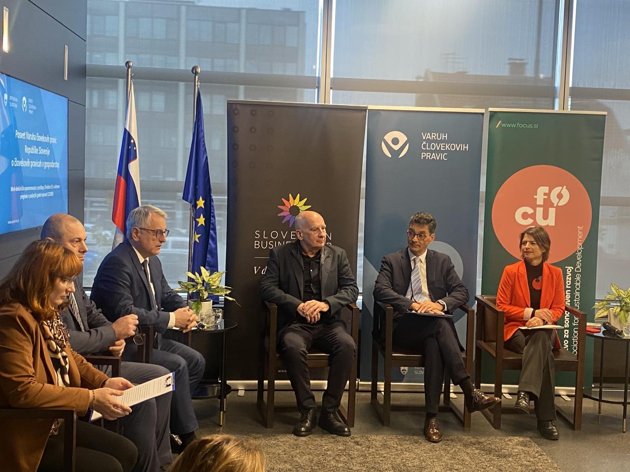 On 23 November 2023, the Human Rights Ombudsman in the role of the national human rights institution, in collaboration with Focus, Association for Sustainable Development, and SBC – Slovenian Business Club, organised a panel discussion on human rights in business and industry. The respect and protection of human rights and the environment is no longer only an obligation of the state but also a responsibility of industry and business. The participants agreed that it is important for companies to assume responsibility for violating human rights and negative impacts on the environment and climate change along the entire value chain.