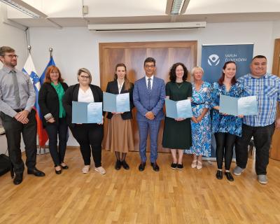 A total of six candidates from Slovenia responded to the tender, who successfully defended their diploma, master’s or doctoral thesis in the period from 1 January to 31 December 2022 at a university or higher education institution in Slovenia or abroad. On 25 September 2023, Ombudsman Svetina awarded four of them with certificates of recognition at the premises of the Ombudsman’s institution.