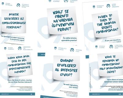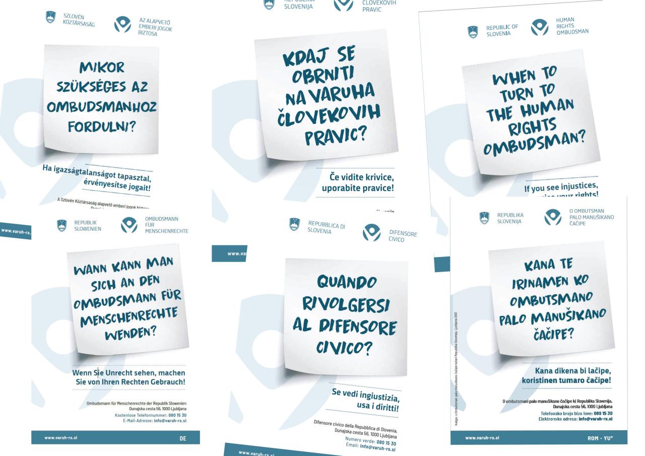 Varuh človekovih pravic (Varuh) je prenovil porocila-projekti/promocijska-gradiva/infomativne-zlozenke-o-varuhu-slo-hun-ita-eng-de/, ki so vsem, ki se želijo obrniti nanj ali jih zanima poslanstvo institucije, na voljo v italijanskem in madžarskem jeziku, porocila-projekti/promocijska-gradiva/informativna-zlozenka-o-varuhu-v-romskih-jezikih/ ter v angleški in nemški varianti. Varuh želi s tem pripadnice in pripadnike različnih narodnih in etničnih skupin, ki živijo v Sloveniji oziroma vse tiste, ki prebivajo v Sloveniji in ne razumejo slovenskega jezika, v njim razumljivem jeziku obveščati o svojem poslanstvu in možnostih, ki jih imajo pri varovanju svojih pravic s pomočjo institucije. Zloženke bodo na sedežu Varuha in na drugih mestih na voljo tudi v tiskani obliki in v pomoč vsem, ki nimajo dostopa do svetovnega spleta ali pa se v poplavi informacij tam ne znajdejo.