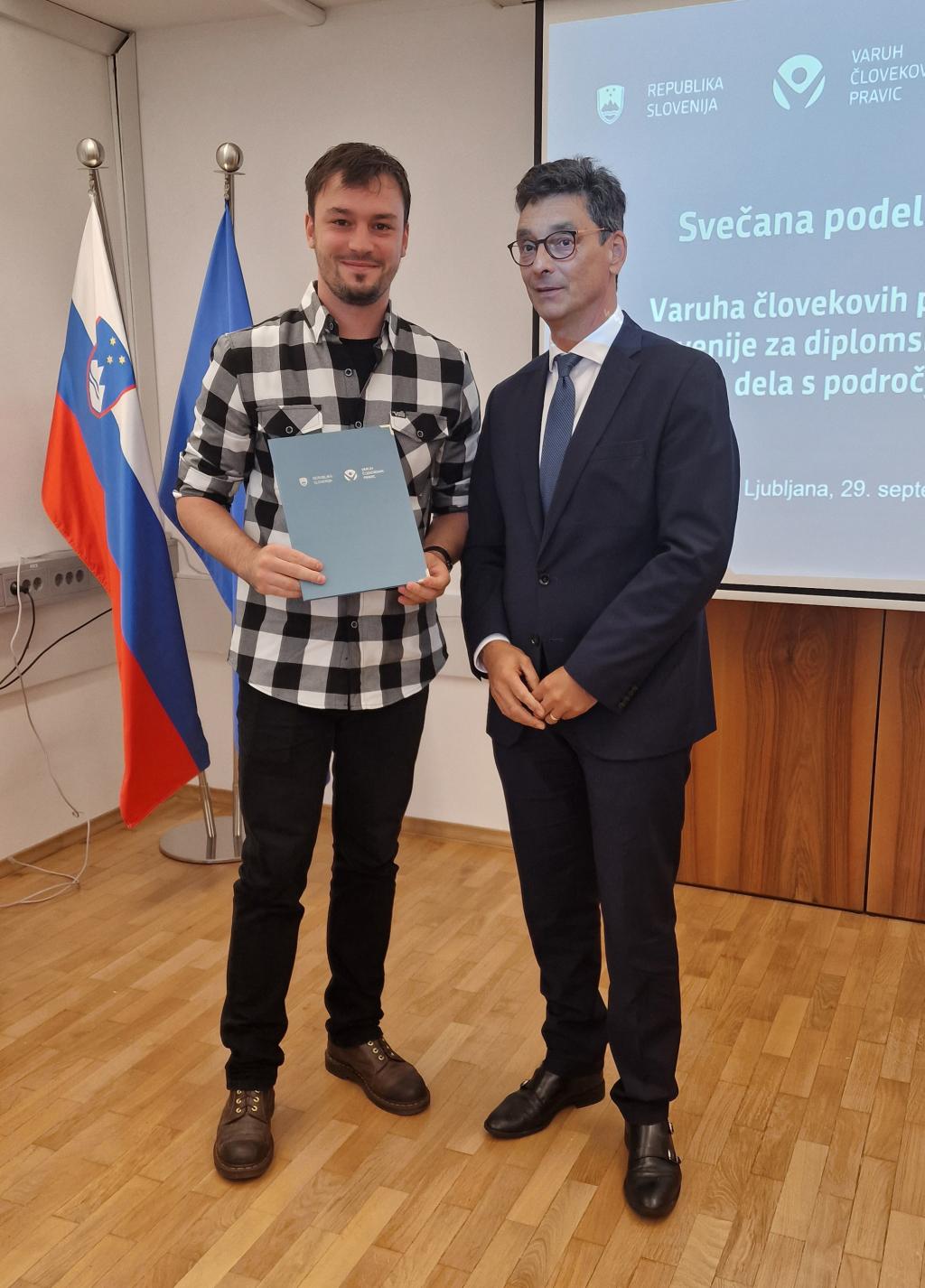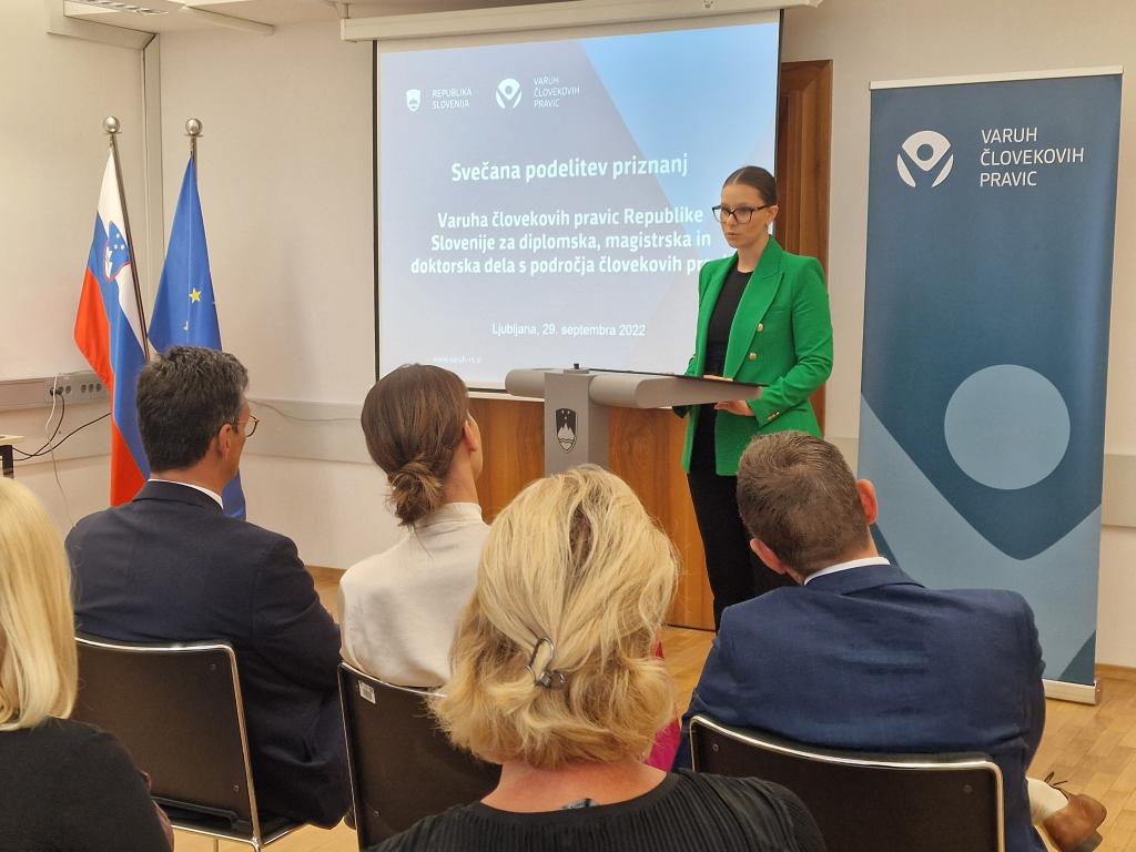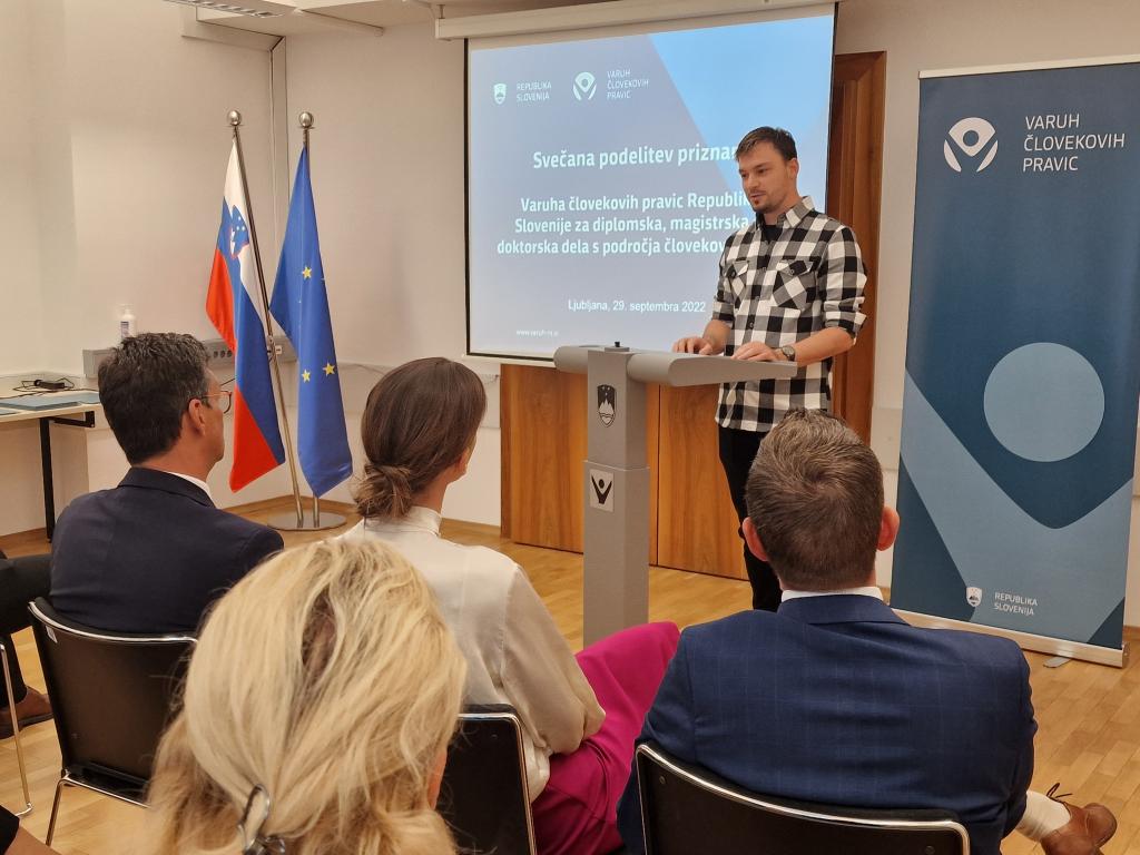 Na natečaj se je prijavilo 9 kandidatk in kandidatov iz Slovenije, ki so v obdobju od 1. 1. do 31. 12. 2021 uspešno zagovarjali diplomsko, magistrsko ali doktorsko delo na univerzi oziroma visokošolskem zavodu v Sloveniji oziroma v tujini. Varuh človekovih pravic Peter Svetina je danes, 29. 9. 2022, v prostorih institucije Varuha nagrajencem podelil priznanja.
