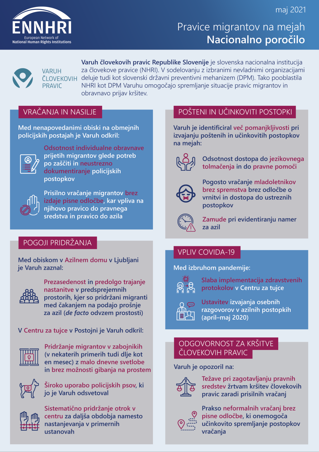 Varuh človekovih pravic je kot Nacionalna institucija za človekove pravice v Sloveniji (NHRI), ki med drugim izvaja naloge nadzora, pripravil poročilo o stanju človekovih pravic migrantov na mejah. Poročilo je bilo pripravljeno v okviru projektahttp://ennhri.org/rights-at-borders/#national-report-slovenia - -new-window "Opens internal link in current window" (ENNHRI), katerega namen je z različnimi dejavnostmi evropskih NHRI-jev, kot so krepitev zmogljivosti, zagovorništvo, komuniciranje in poročanje, doseči boljšo promocijo in zaščito človekovih pravic migrantov na mejah.